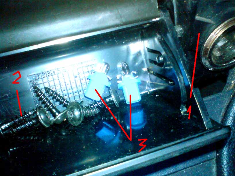 в верху виден снятый задний коншейн магнитолы (для сятия отвернуть два самореза -- цифирь 2 на карине первой)